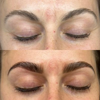 Brow lamination is a cosmetic treatment designed to give your eyebrows a fuller, more defined look by making the hairs appear more uniform and set in place. It’s often called a "brow perm" because the process involves applying a chemical solution to straighten and shape the brow hairs. The result is smooth, sleek, and fuller-looking brows with the hairs lying flat in the desired direction. Not to be confused with microblading which is a tattooing method.